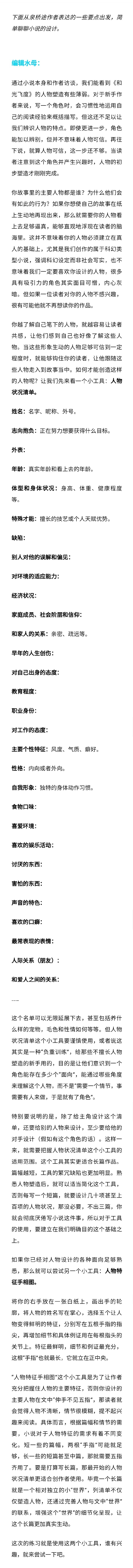 怎样让自己笔下的人物… - @不存在科幻的微博 - 微博 (weibo.com) 怎样让自己笔下的人物更加生动形象?本期 未来局编辑聊写作 由编辑水母与作者泉桥途聊小说《和光飞度》(小说原文微博正文),并给新手作者介绍两个实用小工具: