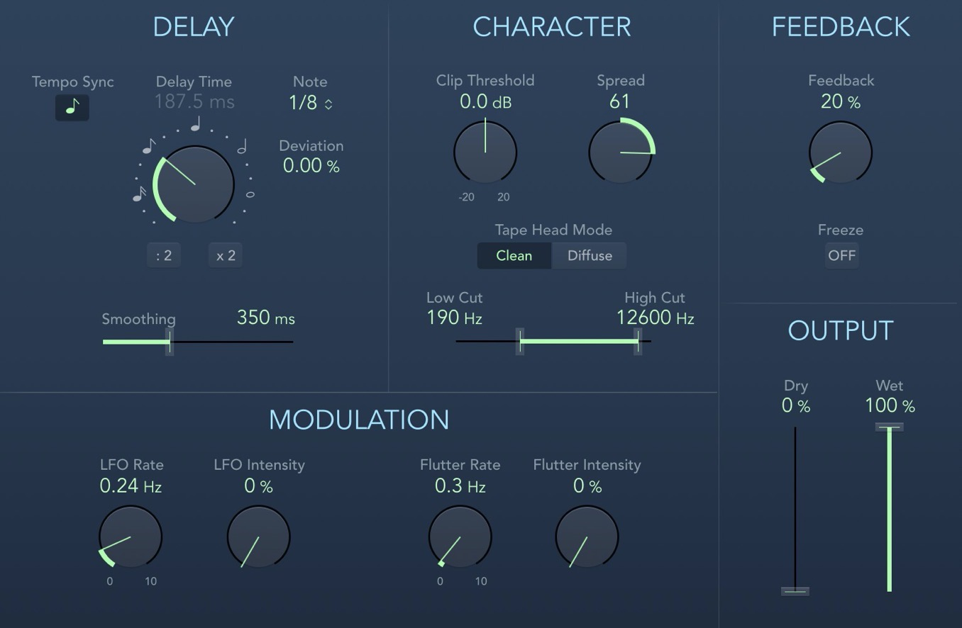 首先是延迟。这主要是,以突出人声并增加声音的深度和厚度为目的使用的。以及,通过将延迟音往左右延伸,也可以增加声音的广度。