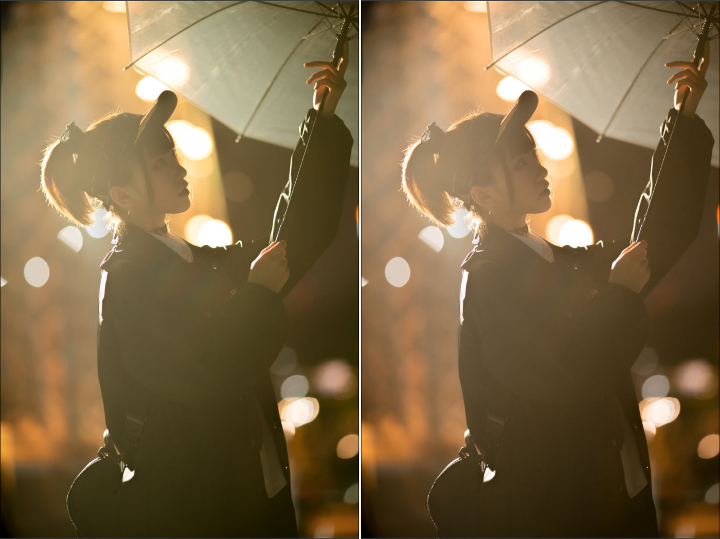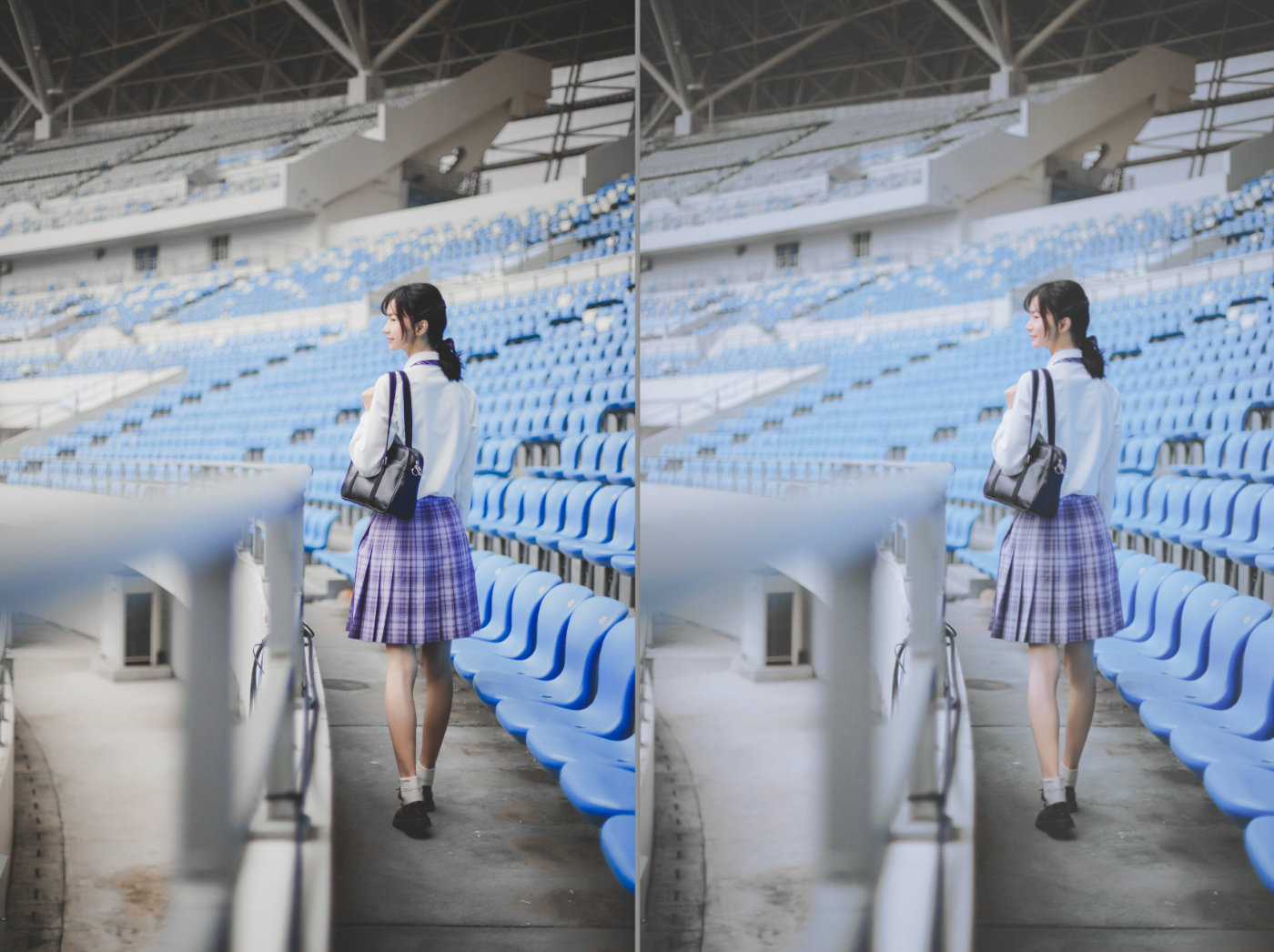 上面左图为学员拿来向我求助的图片,大抵意思就是拍摄当天天气不好,出来的照片总有点脏脏的,调色没方向,不知道怎么才能弄干净。而右图则是我把他的图截图下来在PS里两个步骤之后的效果,降低紫色以及地面上黄绿杂色的饱和度,然后整体画面加青。虽然只是短短两步,但画面却的确干净清爽了很多。其实这就是比较常见的去除杂色的手法,画面以青蓝色为主,于是将一小块一小块的黄绿色块去掉,将紫色也降低饱和度使得它跟蓝色主调更靠近,画面加青也是为了更加统一整体的色调,这样画面就会变得干净。