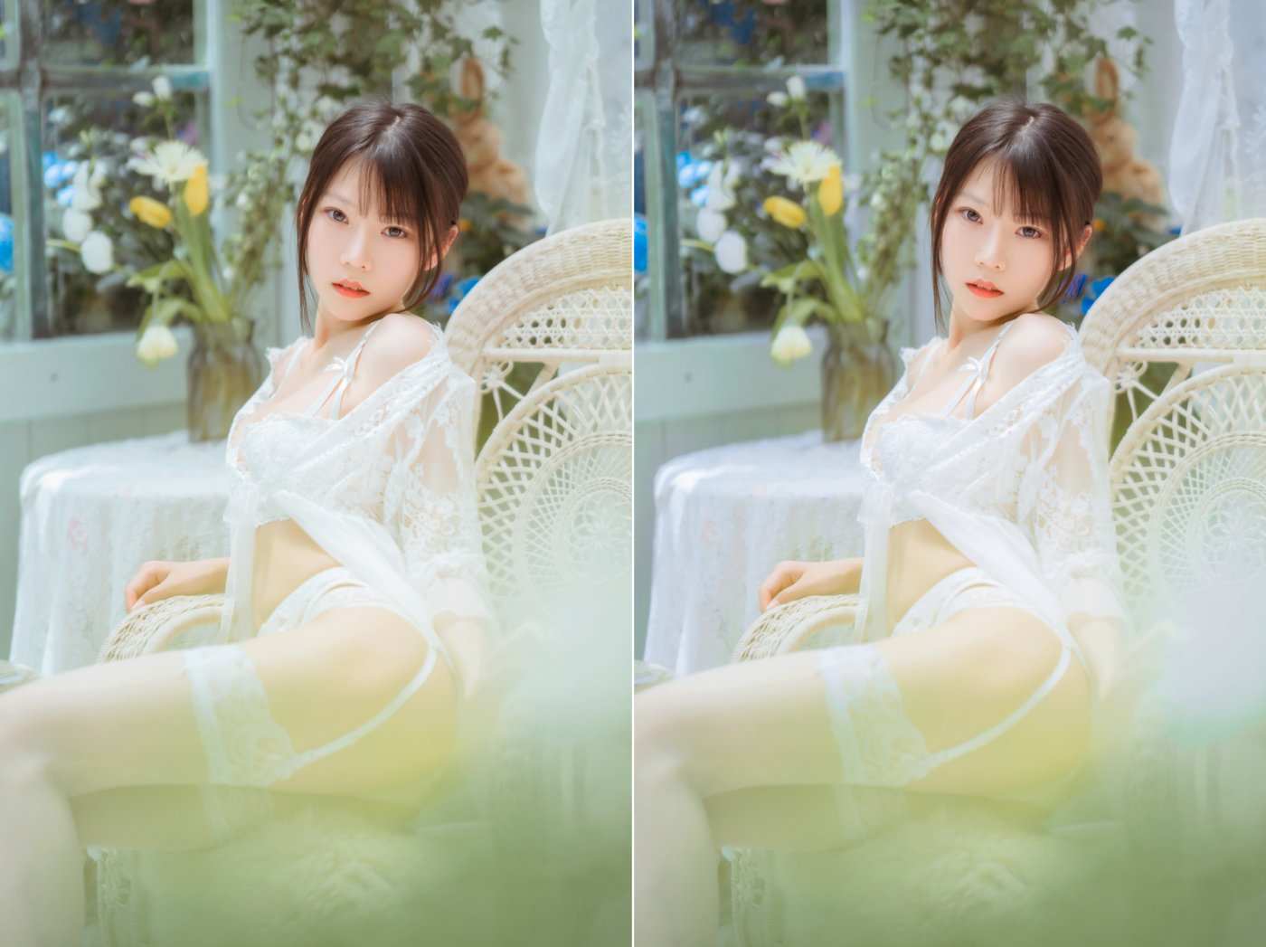 可以看到,这两张图的区别在于,左边的图里,桌布,衣服的白纱以及墙上的白布都被环境中的绿色物体染绿了,而右图我则将这些被染绿的白布调成了偏蓝的色调。如果是按照上面颜色越少越干净的结论,那自然是左图中颜色更少,但是明显却是右图显得更干净。
