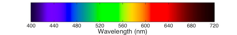 我们平时所说的颜色,其实是以光谱分布函数来描述的。将光谱色根据波长由短到长排列分布大概如下(这只是一种相对简单的裁切法,真正的光谱色纯度太高无法在屏幕上显示):