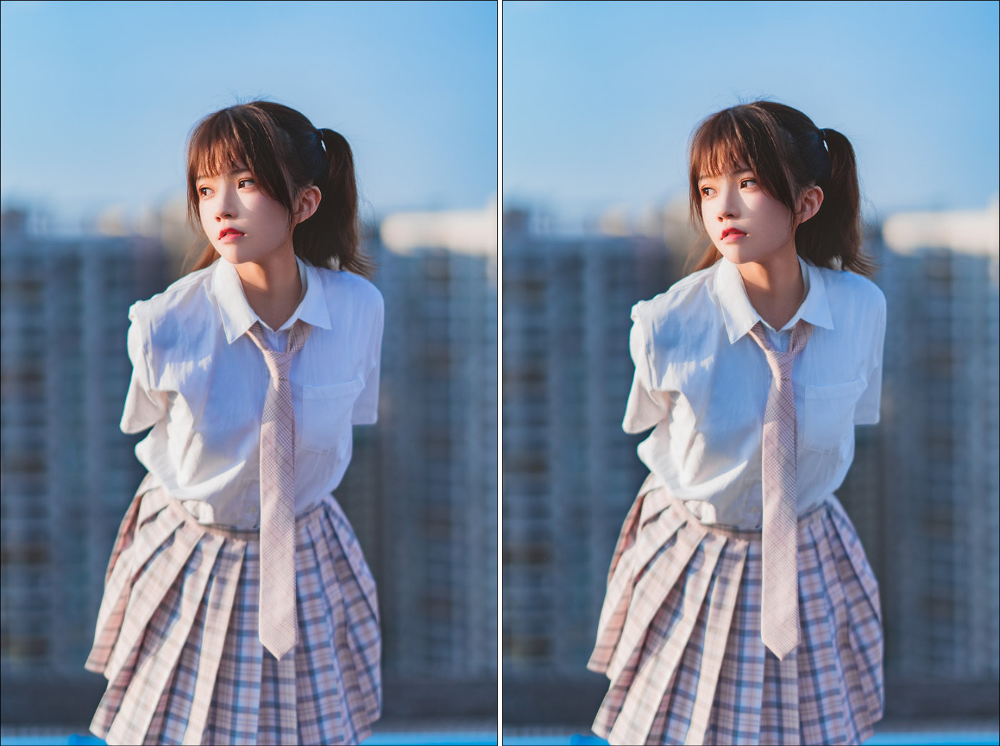 像这两个例子,就是把衣服的紫色改成了蓝色。明明衣服应该是白色的,为什么偏蓝就是比偏紫好看呢?就是这个原因----蓝色比紫色在人眼视觉上显得更纯。