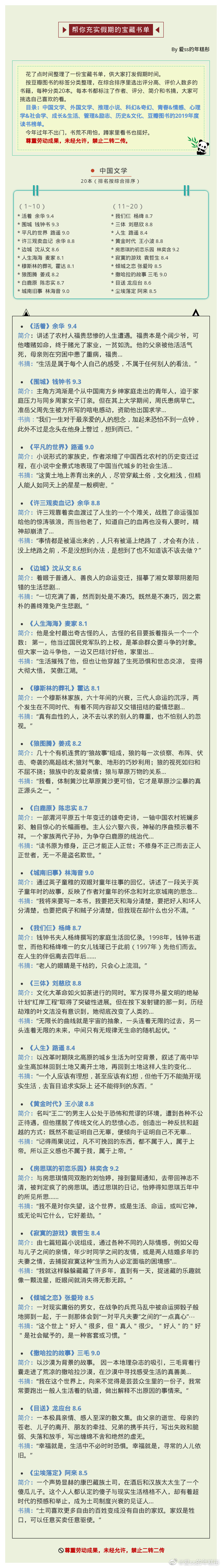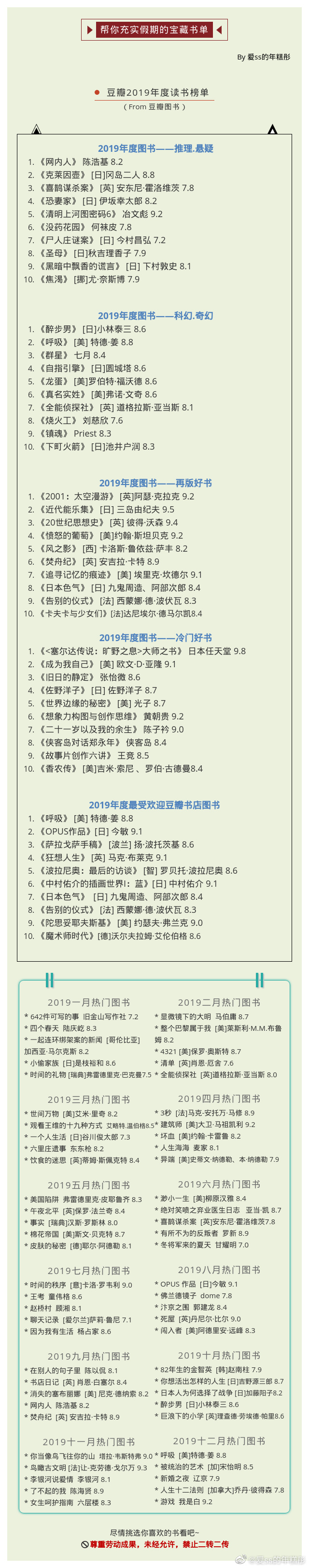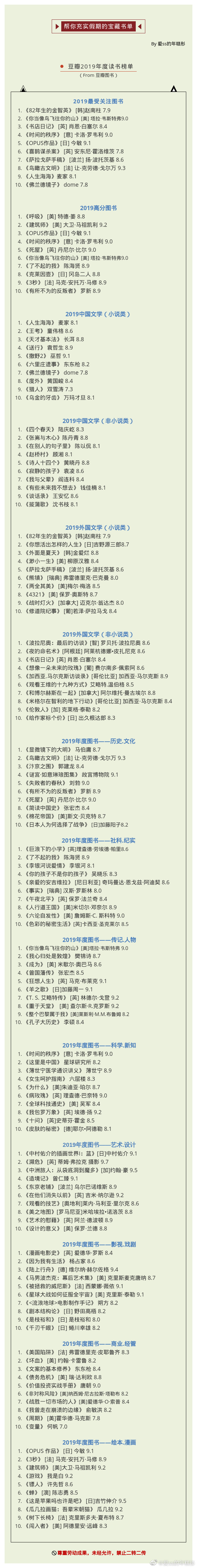 9个分类,每个分类20本,每本书都标注了作者、评分、简介和书摘,可根据分类和简介挑选自己喜欢的看。最后附上db的2019年榜。